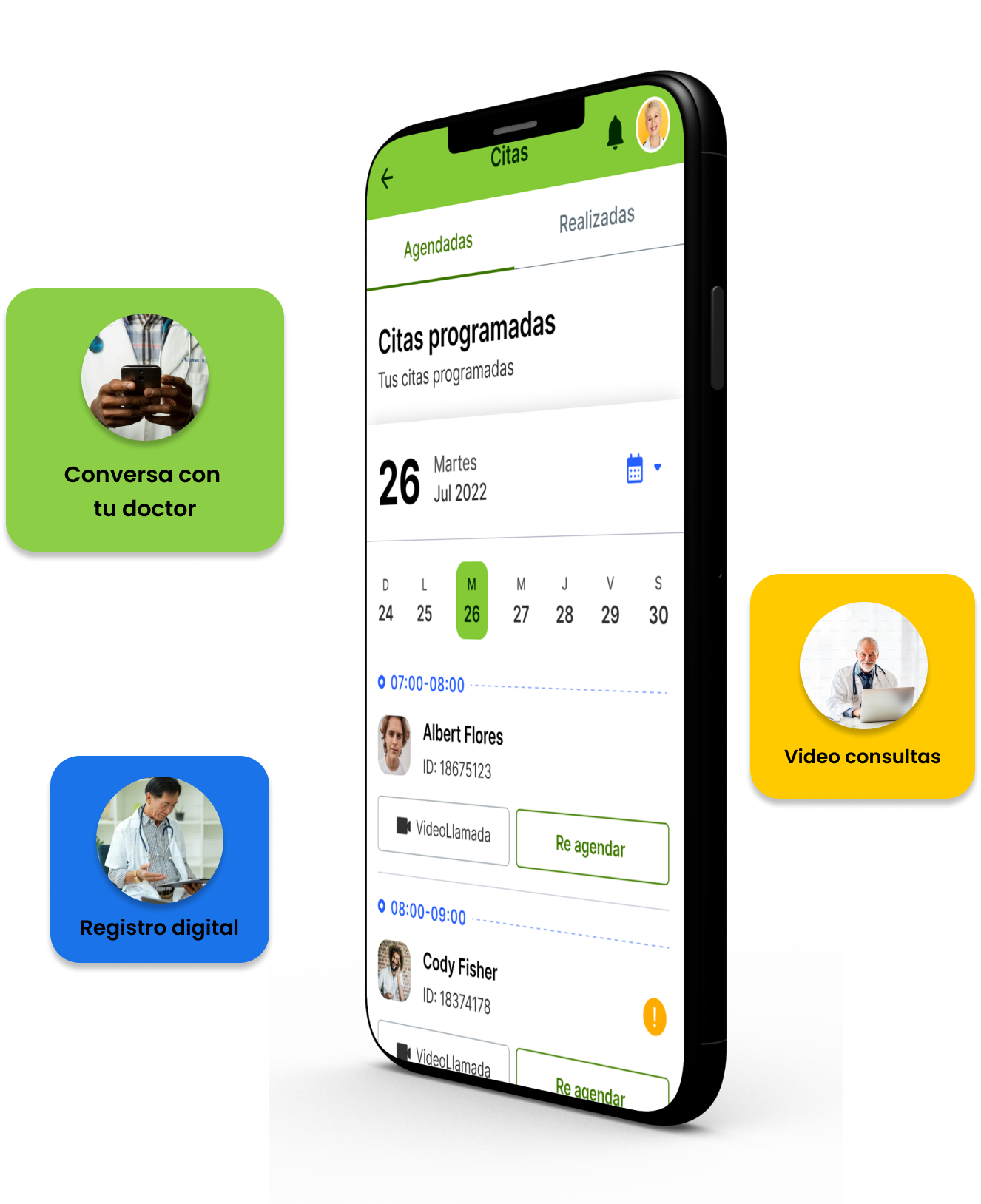 Configure todos sus horarios de atención, defina sus redes de referencia, gestione consultas físicas y virtuales, y maneje sus finanzas de forma electrónica (pagos, recibos, garantías, etc.). Trabaje exclusivamente con Historias Clínicas digitales (sin necesidad de almacenar archivos físicos), prescriba medicamentos directamente desde la aplicación, automatice sus seguimientos y mucho más.