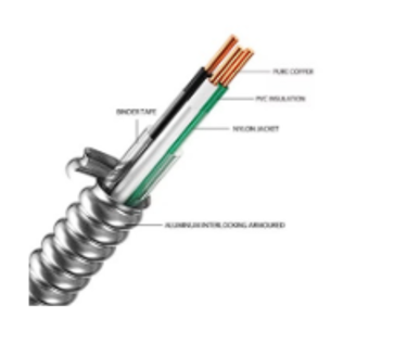 12 AWG UL CUL listed electrical cable with metal-clad aluminum armor, stranded or solid. 12/2 MC cable. 600 V nominal voltage. 1 foot.